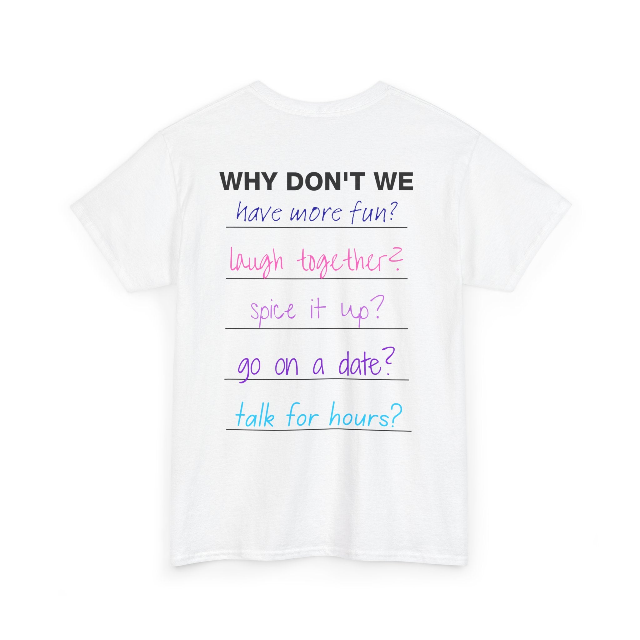 A reminder for everyone: life’s better when we stop holding back. The Why Don’t We tee is more than a shirt — it’s an open invitation to live with curiosity, laughter, and a little extra spark.